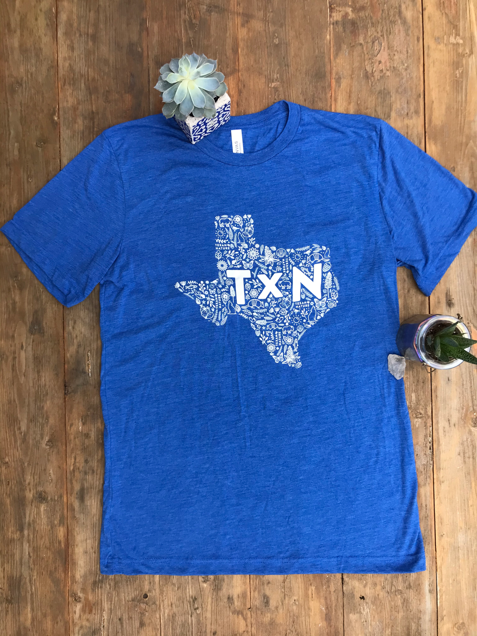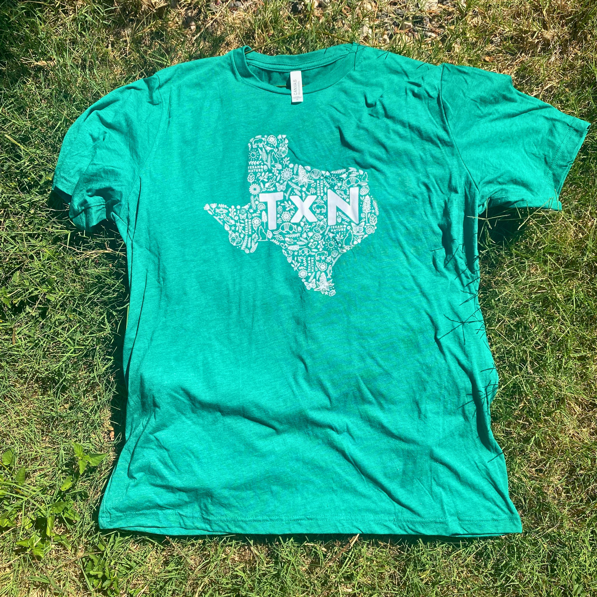 This Texan by Nature-branded shirt is the softest, eco-friendly tee you can wear all year long. The Texas Collection is offered in Charcoal, Royal Blue, Grass Green, and Kelly Green. The shirt features a white Texas design adapted from our bandana print with Texan by Nature's official logo printed thought the print and our shorthand logo, TxN featured in the center.